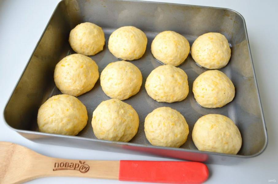 9. Смажьте противень растительным маслом. Стол и руки тоже смажьте маслом. Разделите тесто на 12 частей. Сформируйте булочки, расположите их на небольшом расстоянии. Поставьте булочки в теплую духовку на 20 минут для подъема. Включите духовку на 180 градусов и выпекайте булочки 25-30 минут.