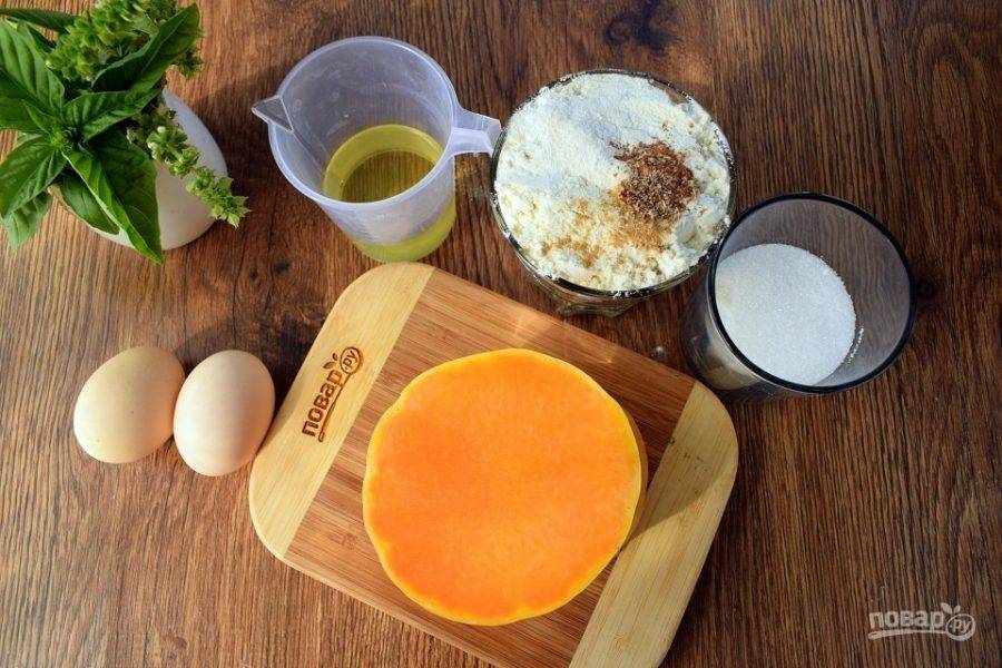 Подготовьте необходимые продукты для теста. Тыкву вымойте. Муку, специи и разрыхлитель просейте.