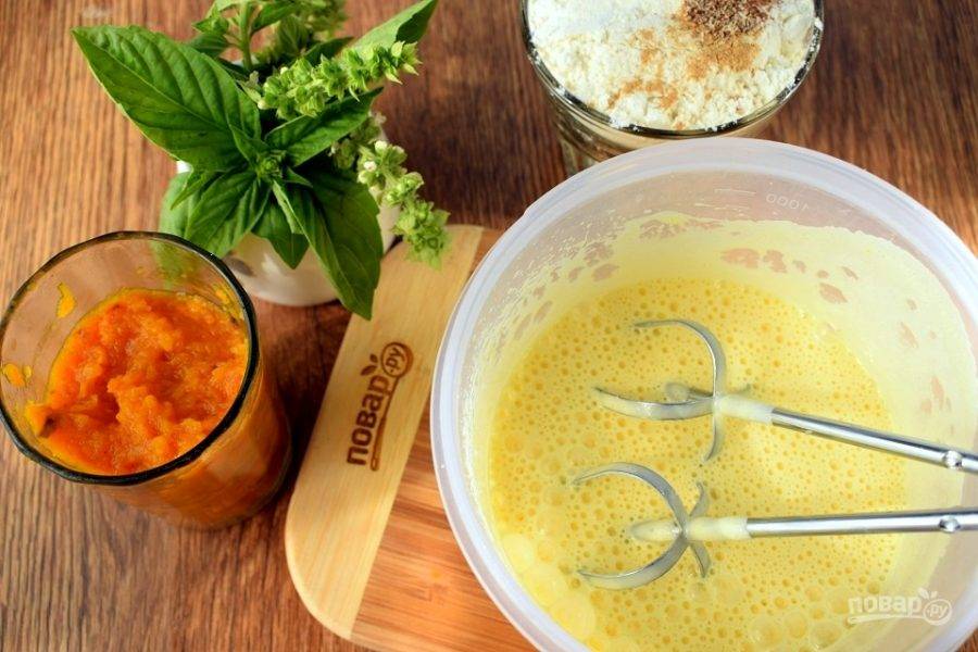 Добавьте тыквенное пюре и размешайте с помощью силиконовой лопатки. Добавьте сухие ингредиенты (муку, разрыхлитель, специи) в 2-3 приема, аккуратно размешайте с помощью спатулы, двигаясь снизу вверх.