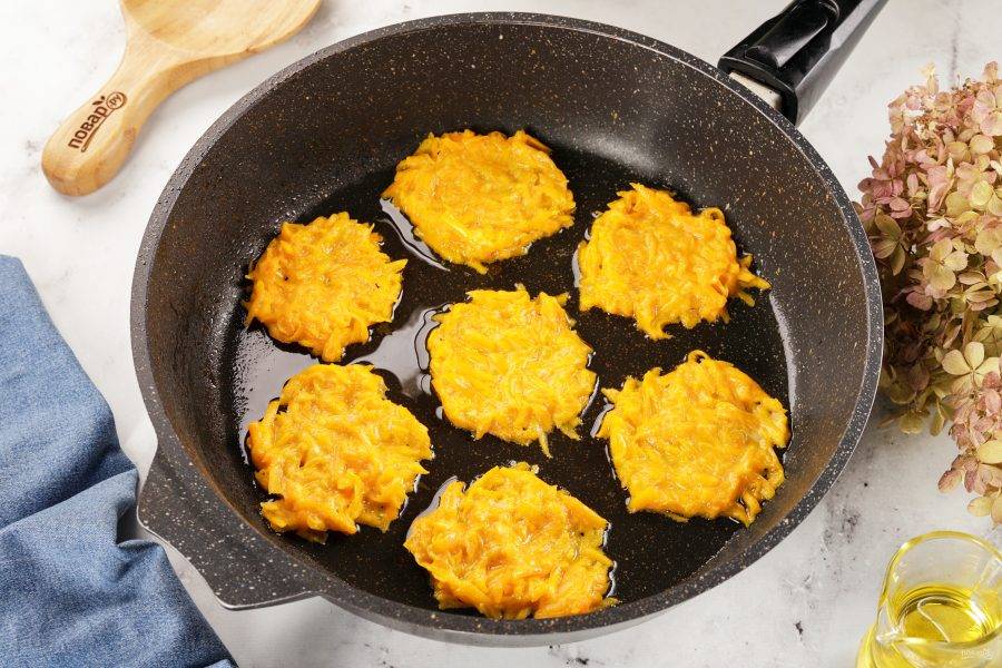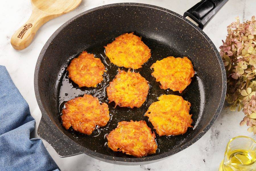 Обжаривайте оладьи с обеих сторон до золотистой корочки на среднем огне, по две-три минуты с каждой стороны. Затем выкладывайте на бумажное полотенце, чтобы убрать излишки масла.