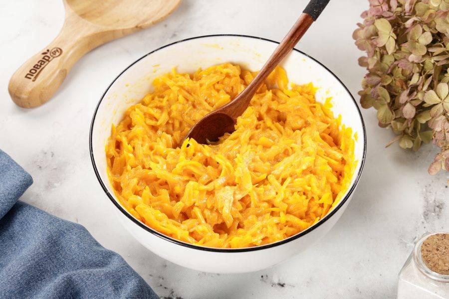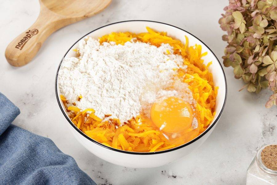 Добавьте к тыкве яйцо, муку и соль.