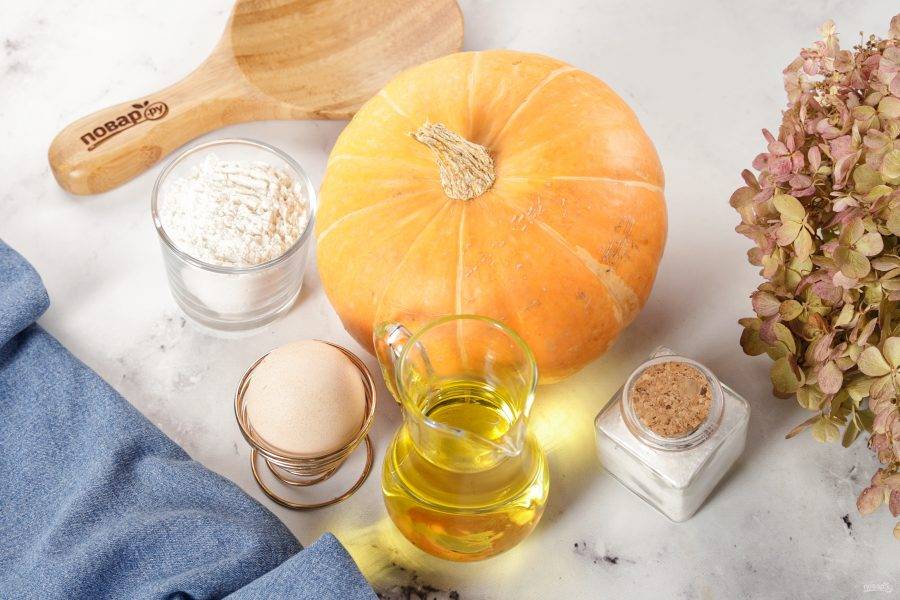 Подготовьте все ингредиенты по списку. Вес тыквы указан после её очистки. Муки может уйти чуть больше или чуть меньше, это зависит от сочности тыквы. По желанию в тесто можно добавить свежую зелень, чеснок, тёртый сыр или яблоко, корицу или другие специи на свой вкус. Каждый раз получается очень вкусно и совершенно по новому.