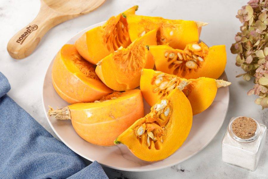 Тыкву помойте и нарежьте на дольки.