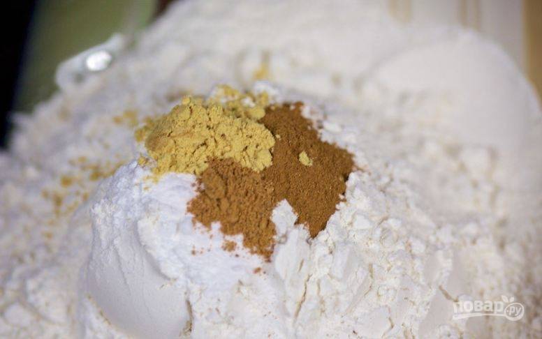 1. Просейте муку, добавьте соду, разрыхлитель, ванилин, корицу.
