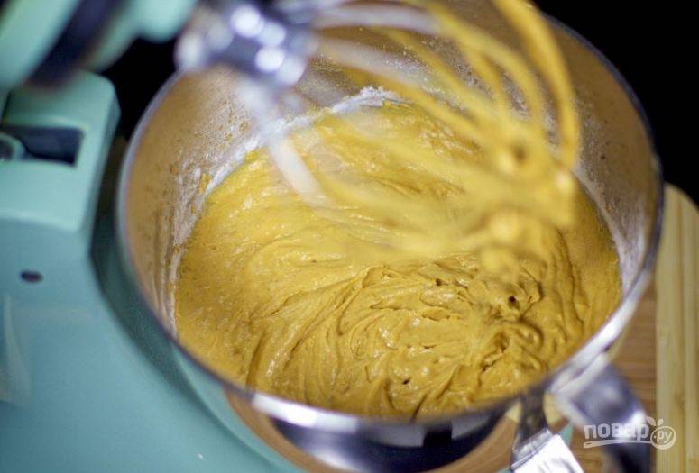 3. Добавьте тыквенное пюре и яйца к мучной смеси, смешайте все ингредиенты миксером.