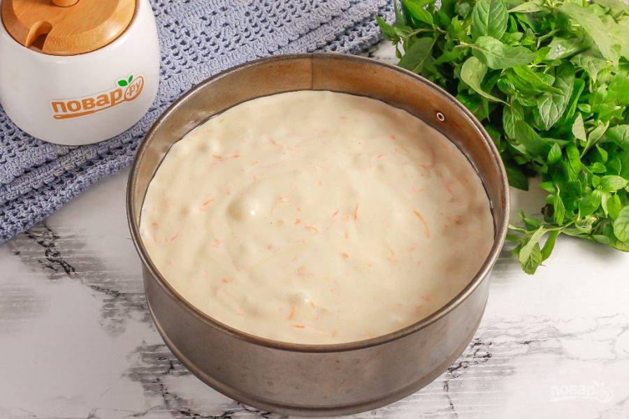 Смажьте форму растительным маслом без аромата или сливочным. Выложите в форму бисквитное тесто и разровняйте его поверхность. Поместите форму в духовку на средний ярус.