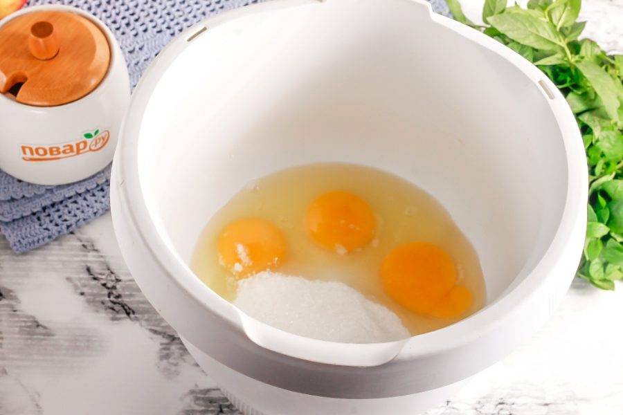 В чашу кухонного комбайна или миксера вбейте куриные яйца, всыпьте соль, ванильный сахар и сахар-песок. Тщательно взбейте все на высокой скорости техники примерно 3-4 минуты. Следите за тем, чтобы не перевзбить яичную массу, так как она может расслоиться.
