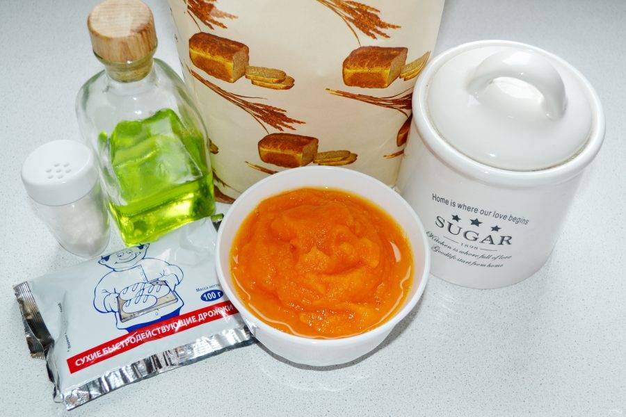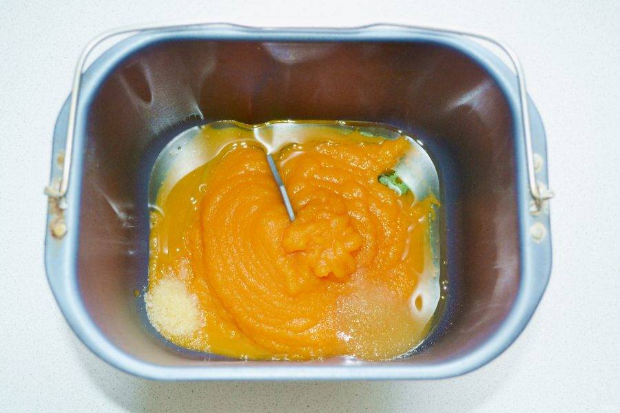 В ведерко хлебопечки выложите тыквенное пюре, растительное масло, соль и сахар.