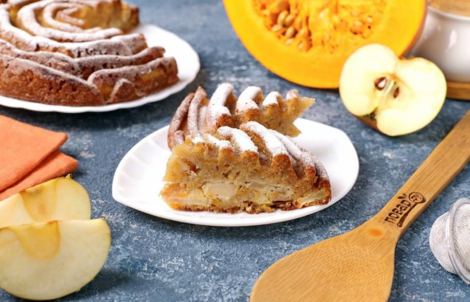 Нежный осенний пирог к чаю. Благодаря тыкве он получается невероятно сочным и темным. Яблоки добавляют сладость и оригинальные вкусовые нотки. Приготовьте сами!