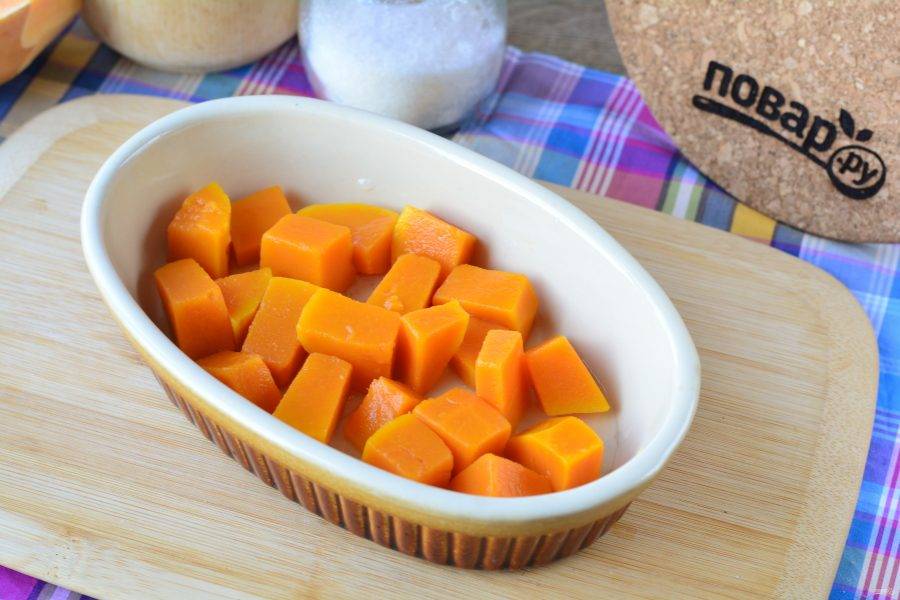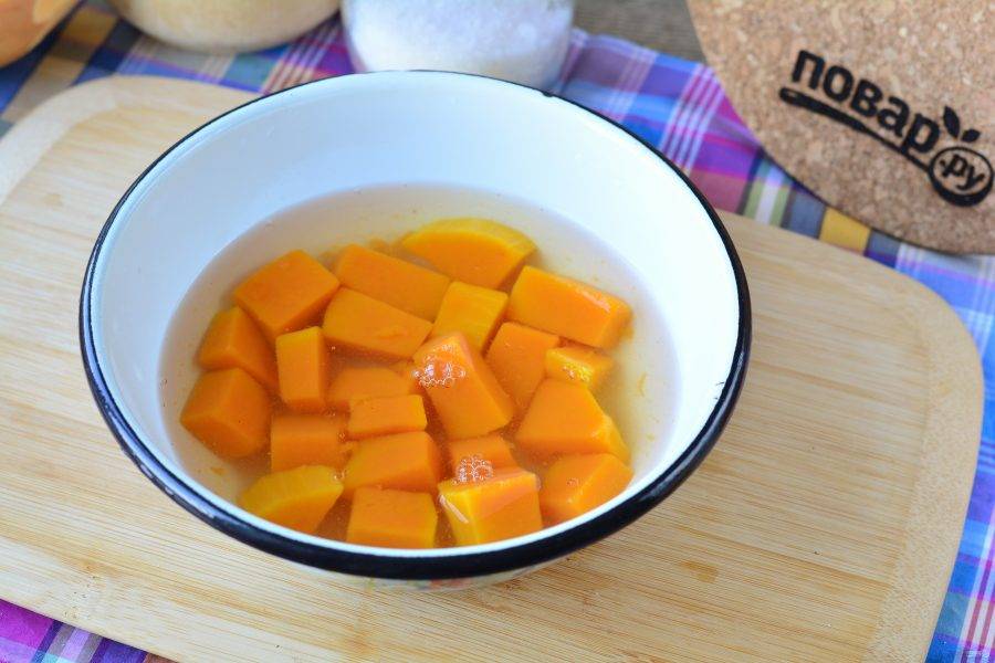 Тыкву почистите, нарежьте средними кусочками и отварите до мягкости. Варите примерно 20-25 минут, потом воду слейте.