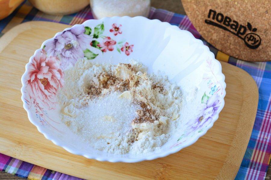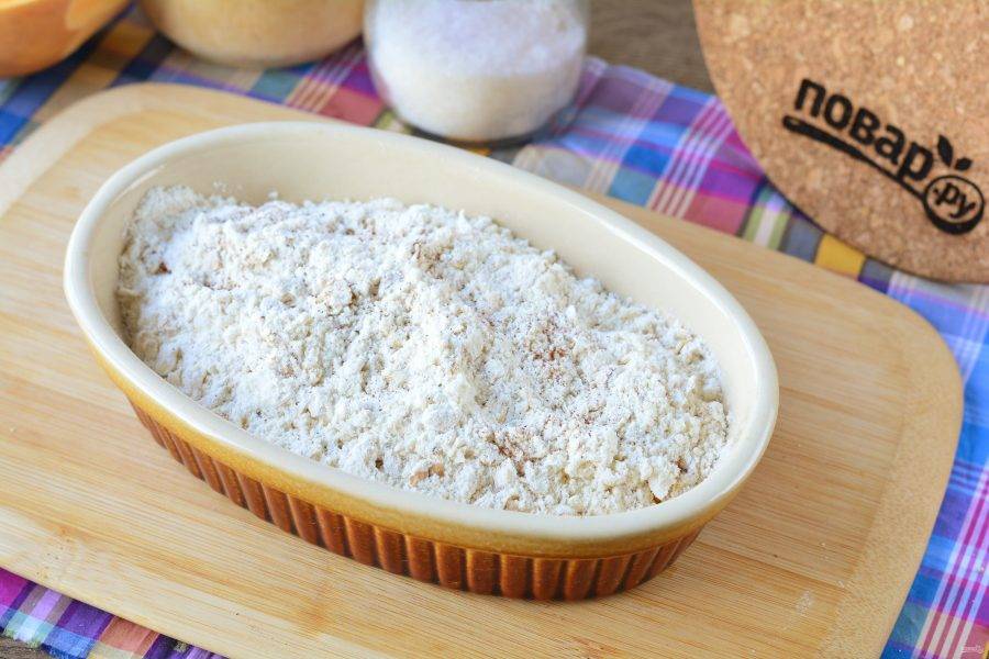 На тыкву насыпьте мучную смесь и отправьте крамбл запекаться в духовку.