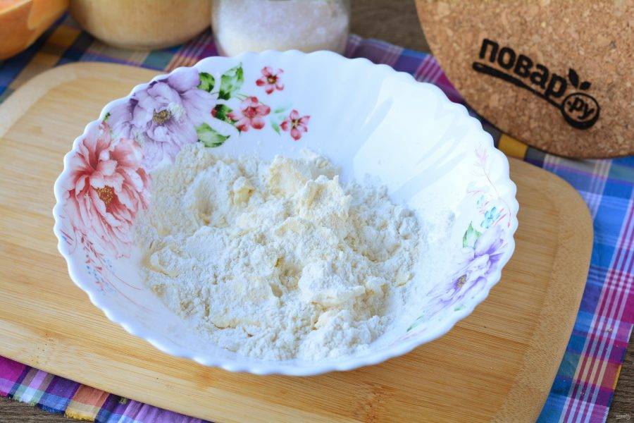 Смешайте сливочное масло комнатной температуры и муку, разотрите.