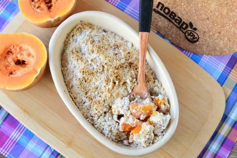 Полезное угощение всегда будет уместным за столом. Тыквенный крамбл — это сочетание полезного овоща с овсяными хлопьями. Блюдо запекается в духовке.