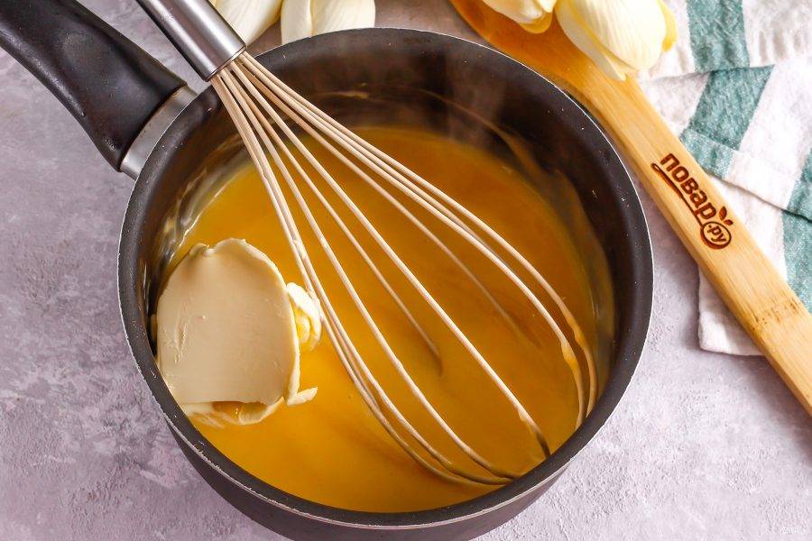 Вмешайте в него сливочное масло. Некачественный продукт в горячем креме может расслоиться, поэтому выбирайте качественное сливочное масло!