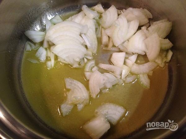 1. Разогреваем в кастрюльке сливочное и оливковое масло, добавим очищенный и нарезанный лук.