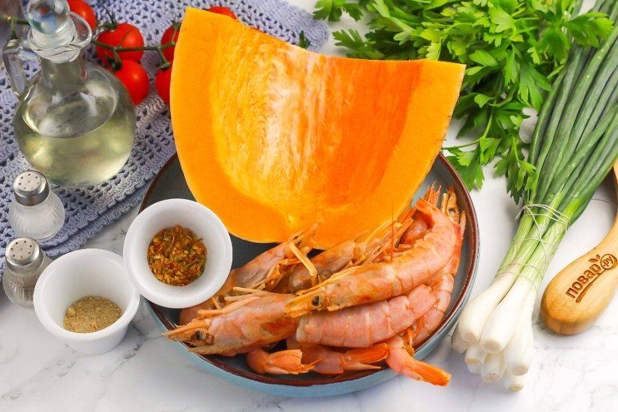 Подготовьте указанные продукты. Очистите тыкву от кожуры, тщательно промойте вместе с зеленым луком. Можно заменить такой лук репчатым или красным. Креветки разморозьте и слейте выделившуюся жидкость.