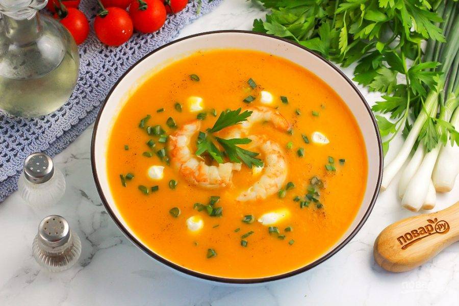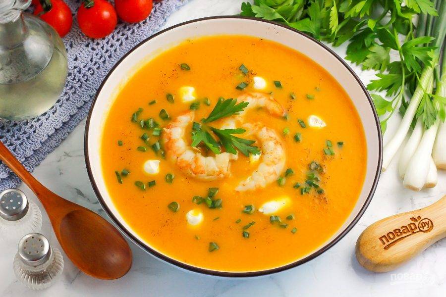 Колоритный тыквенный суп с креветками — это магия разнообразных вкусов: сладкого, соленого, пряного и бархатистого. Подавайте его со сливками, сметаной или майонезом, а также с поджаренным хлебом.
