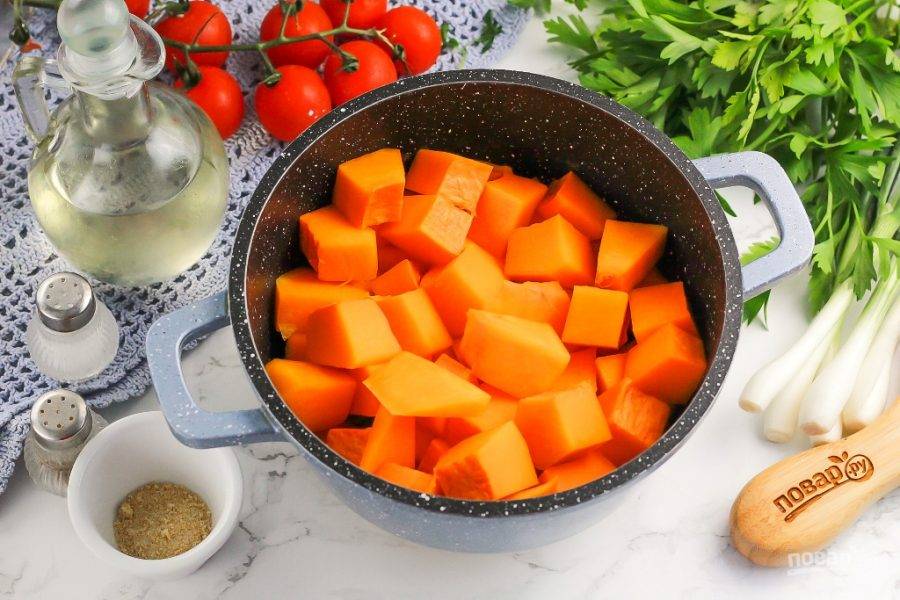 Нарежьте тыкву средними или крупными кубиками и добавьте в емкость. Перемешайте и обжарьте 3-4 минуты.