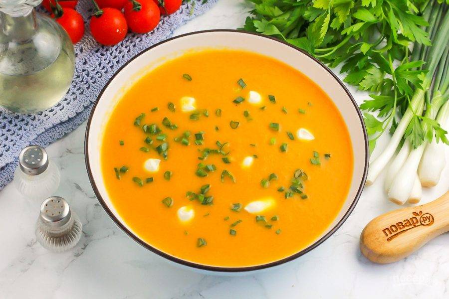 Измельчите оставшуюся зеленую часть лука. Разлейте тыквенный суп в тарелки и присыпьте зеленым луком, выложите капли майонеза или сметаны, полейте сливками.