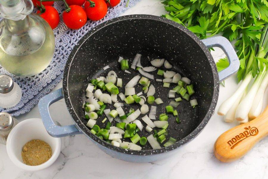 Прогрейте кастрюлю с антипригарным дном или казан на плите, добавив растительное масло. Нарежьте белые стебли зеленого лука и высыпьте в емкость. Припустите буквально 2-3 минуты до легкой румяности.