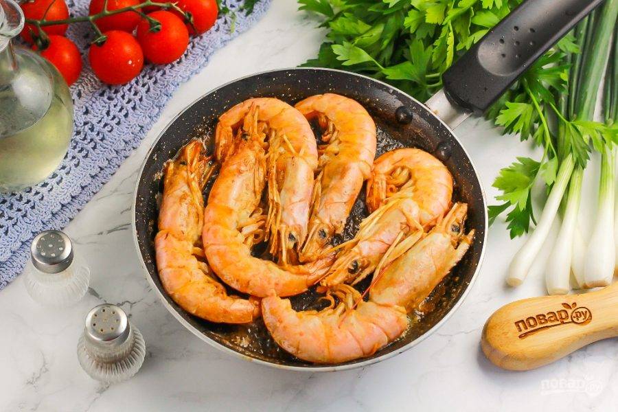 Прогрейте на сковороде растительное масло и выложите креветки. Обжарьте примерно 2-3 минуты с одной стороны до румяности. Имейте в виду, если креветки крупные, то потребуется чуть больше времени на среднем нагреве.