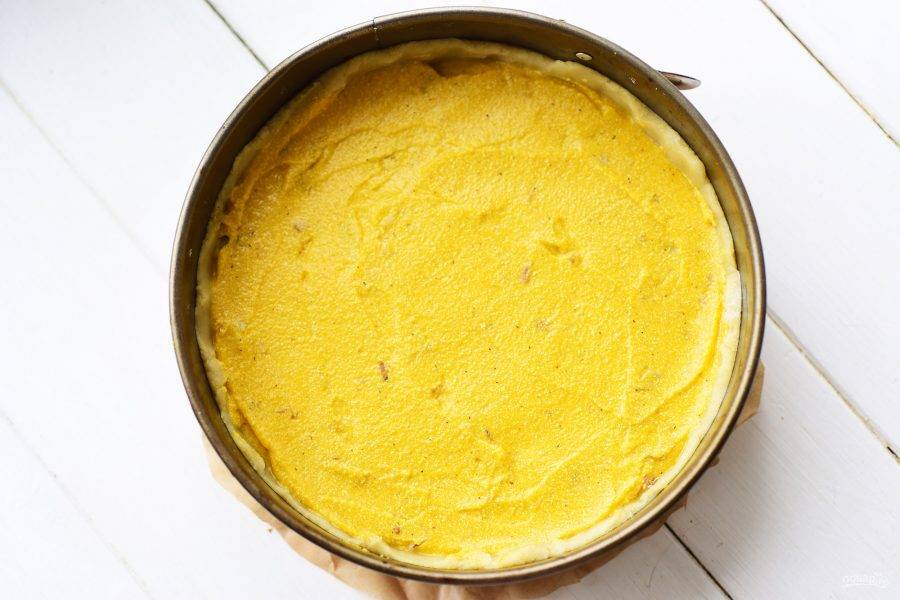 На подготовленную ранее основу из песочного теста выложите всю тыквенную начинку, разровняйте ее ложкой.