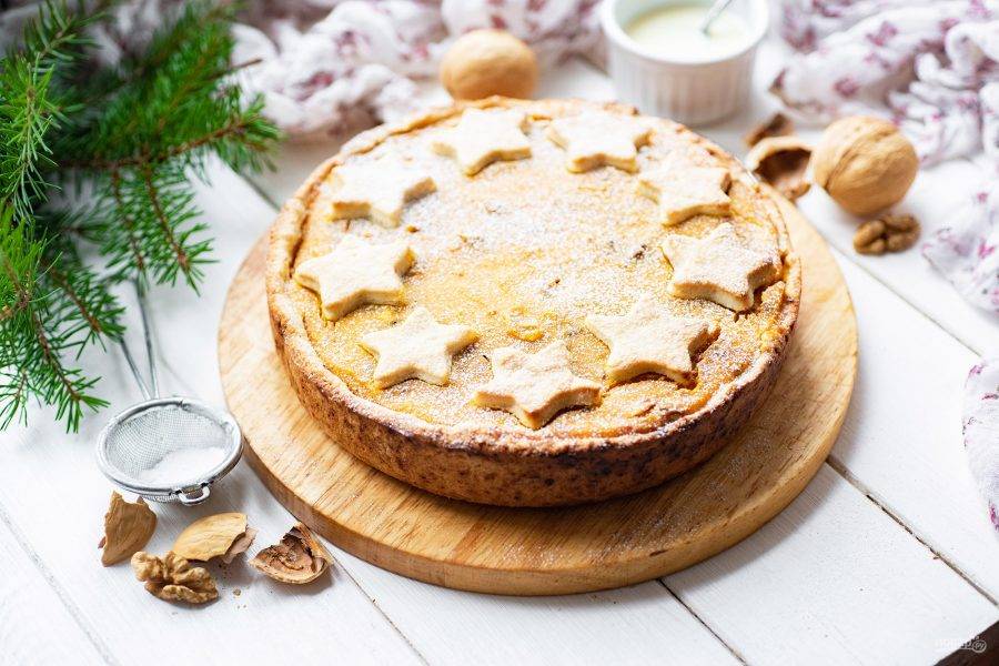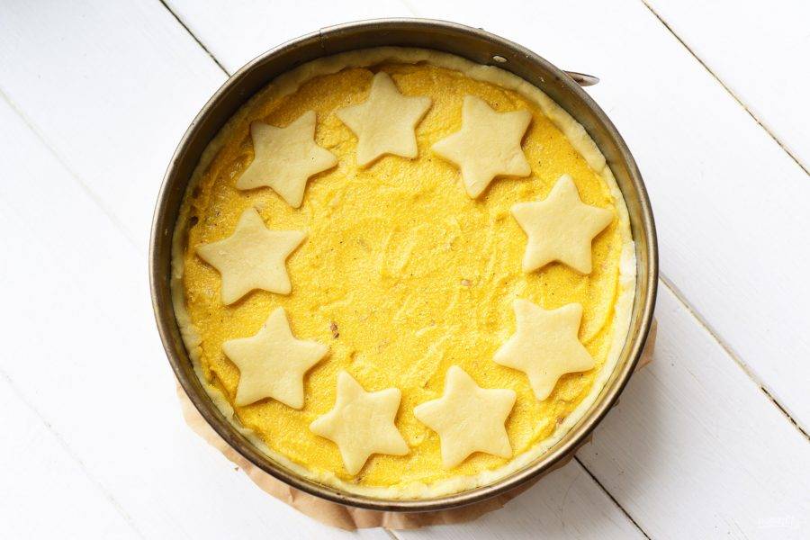 Если у вас после формирования основы остались излишки теста, то можно приготовить из них украшения. Я остатки теста раскатала и вырезала вырубкой для печенья звезды. Звезды из теста я разложила по поверхности тыквенной начинки. Заполненную форму отправьте в уже разогретую до 180 градусов духовку на 45 минут выпекаться.