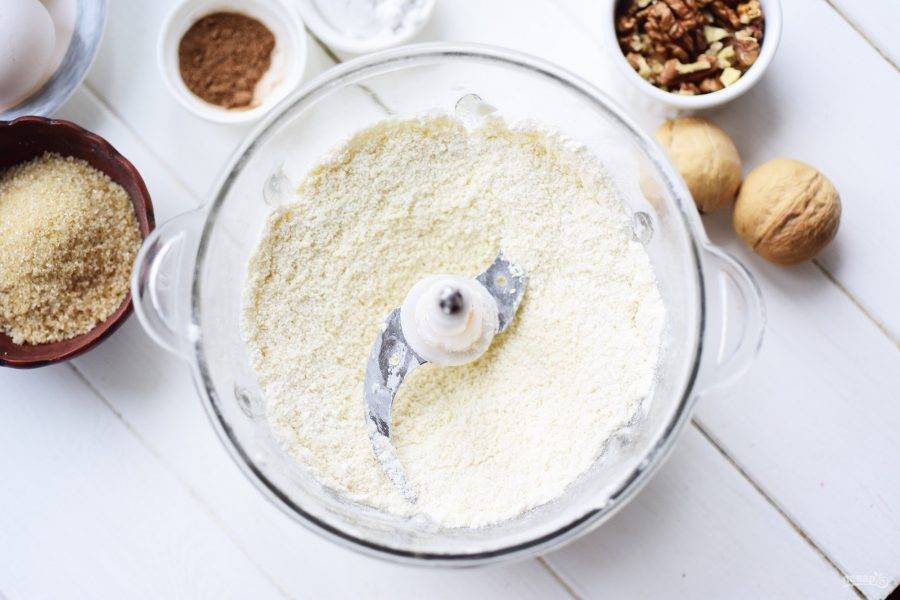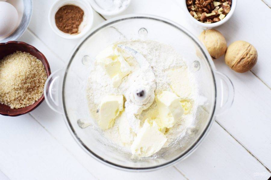 В чашу блендера выложите всю муку, добавьте ледяное сливочное масло, нарезанное кусочками.