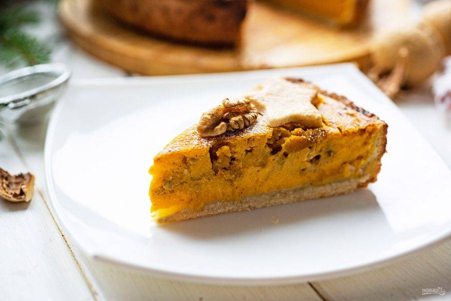 Готовый тыквенный тарт хорошо охладите, можно при желании присыпать его сахарной пудрой, и только тогда приступайте к нарезке на порционные кусочки.