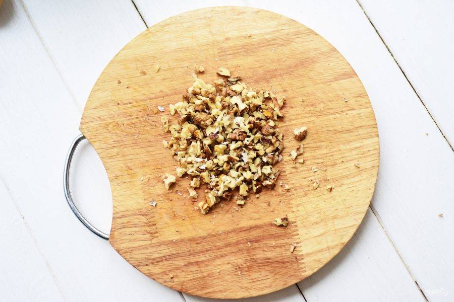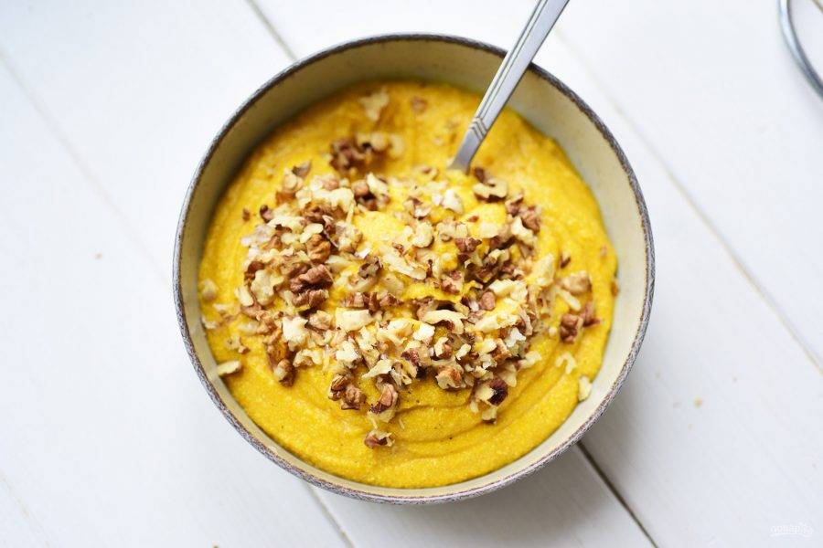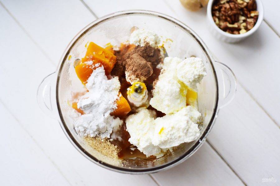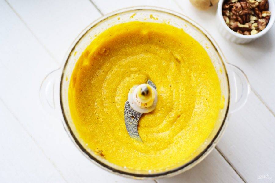 В миску выложите тыквенную смесь из чаши блендера, добавьте к ней мелко порубленные орехи, перемешайте все. Начинка готова.