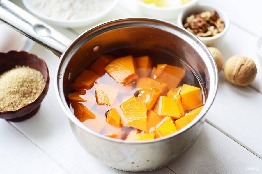 Тыкву очистите от кожуры и семян, нарежьте кусочками, выложите в сотейник, залейте водой и отварите на среднем огне до мягкости.