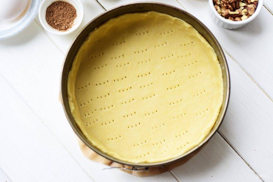Форму для выпекания застелите пергаментом для выпечки. Тесто раскатайте скалкой в форме круга, соизмеримого размеру формы для выпекания с запасом на бортики. Раскатанное тесто перенесите на дно формы и сформируйте из него основу для будущего пирога с бортиками высотой в 4-5 см. Наколите тесто вилкой.