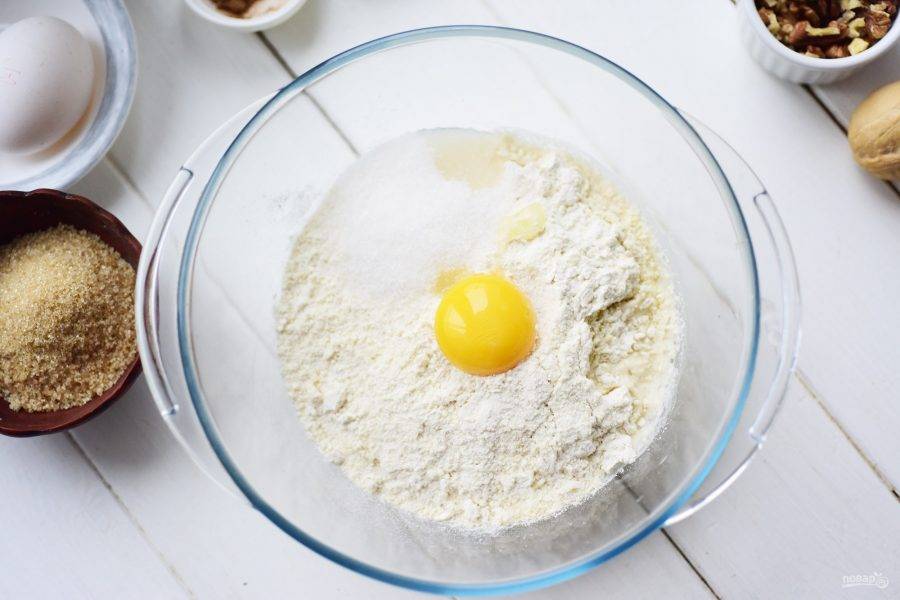 Высыпьте всю мучную крошку из чаши блендера в просторную миску, добавьте белый сахар, один яичный желток и холодную воду.