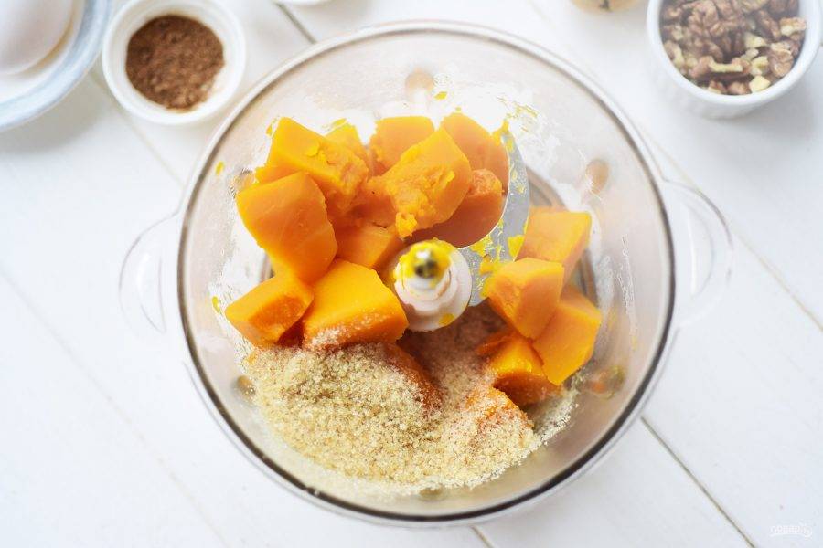 В чашу блендера выложите отварную тыкву (предварительно слив с нее воду), добавьте коричневый сахар.