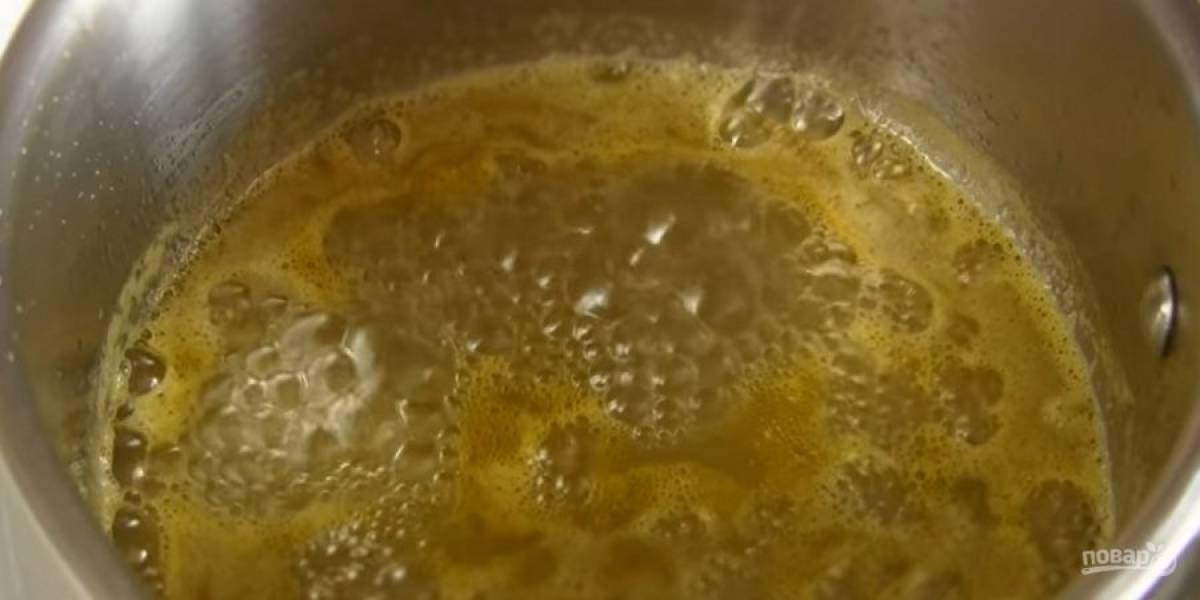 4. Приготовьте крем: отвешенную сметану смешайте с сахаром. Апельсиновый сок смешайте с 3 ст. ложками сахара и проварите на небольшом огне 8-10 минут, постоянно помешивая.