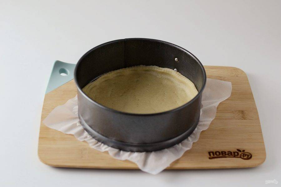 Раскатайте тесто по диаметру формы для выпечки, наколите вилкой. Выпекайте основу для пирога 12 минут при температуре 180 градусов.