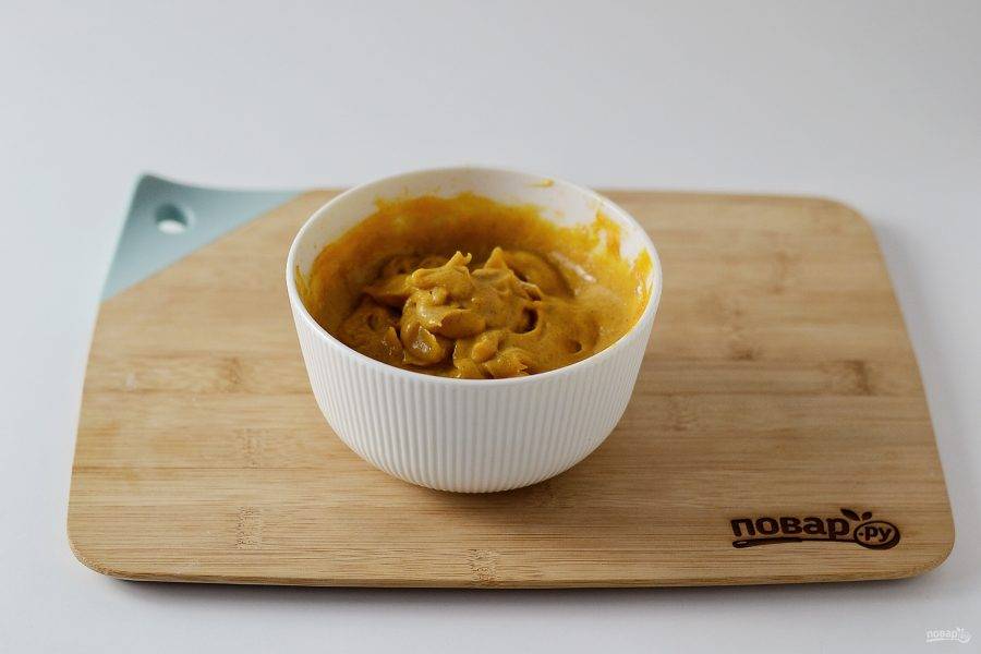Для начинки соедините тыквенное пюре с крахмалом, кокосовым маслом, пряностями и сахаром. Взбейте миксером до однородной консистенции.