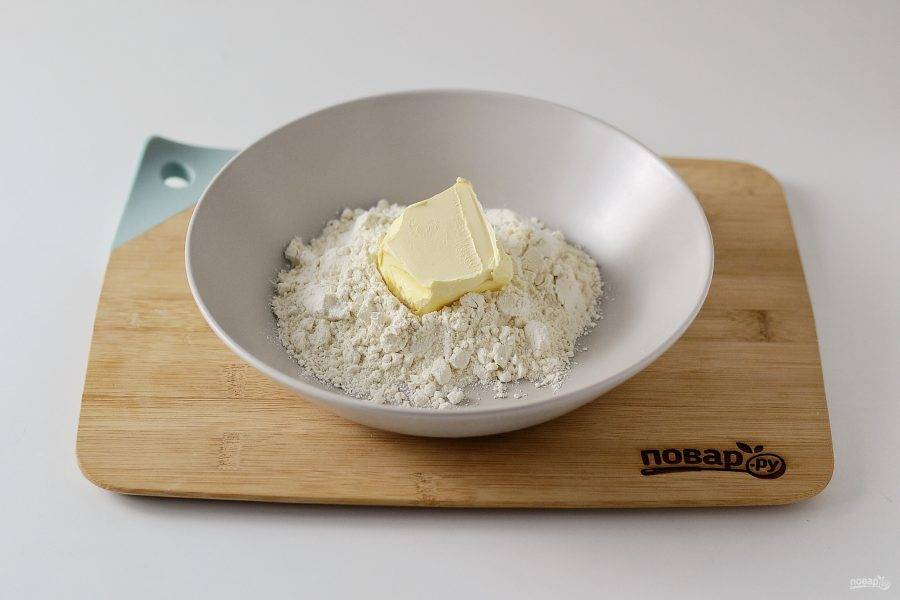 Для теста смешайте муку с солью. Добавьте маргарин, разотрите его в крошку.