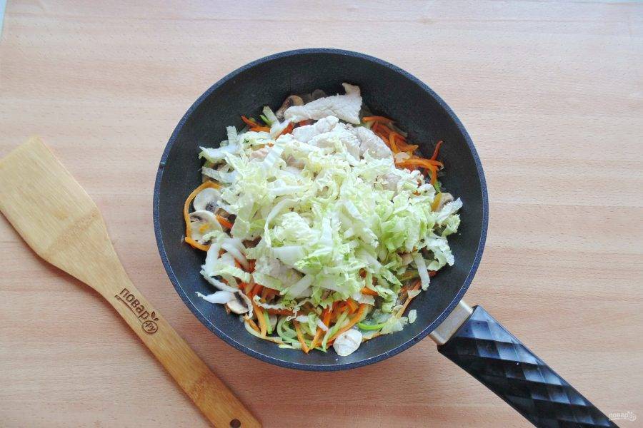 Добавьте нарезанную соломкой пекинскую капусту. Посолите и поперчите, перемешайте овощи с куриным филе. Тушите еще 5 минут.