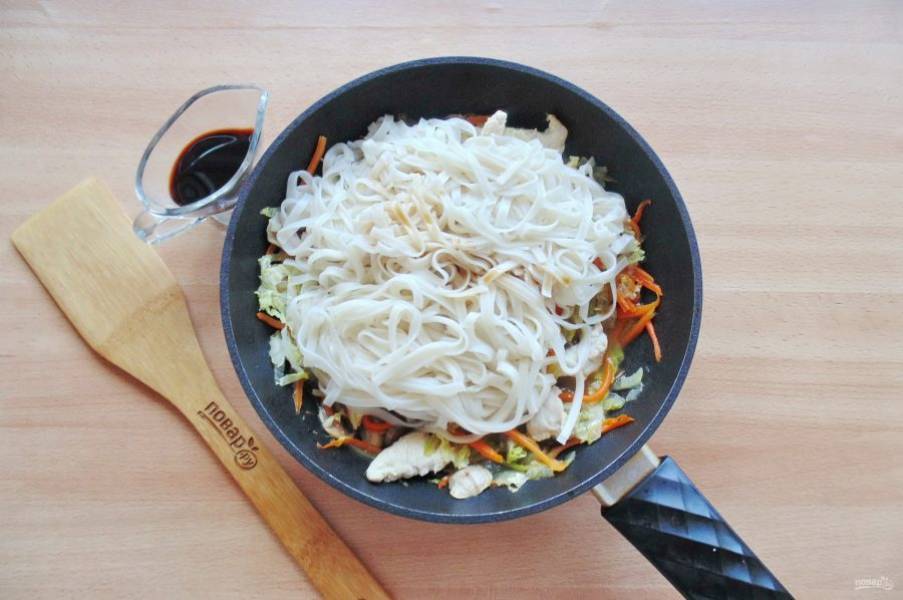 Лапшу удон приготовьте по инструкции на упаковке. Она готовится в течение 4-5 минут. Затем откиньте лапшу на дуршлаг и выложите в сковороду с курицей и овощами.
