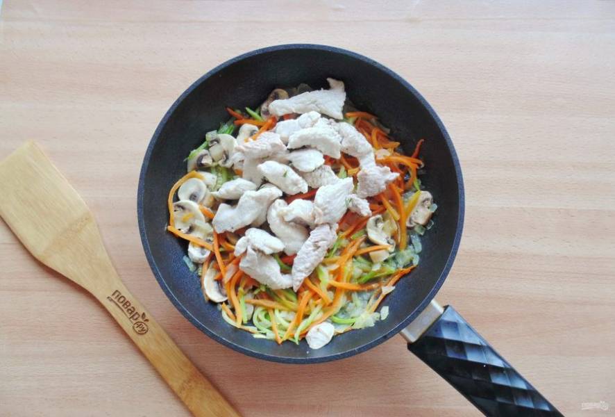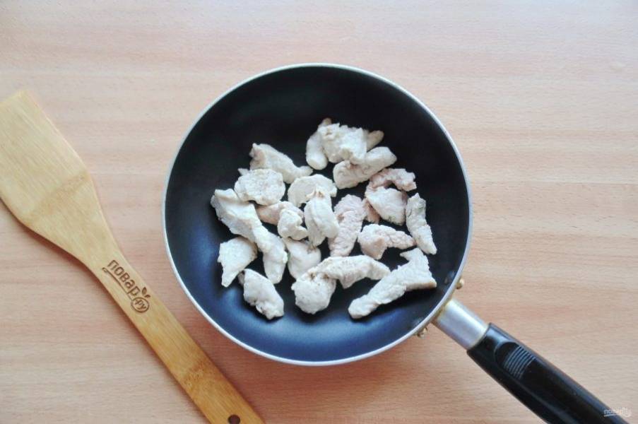 Куриное филе мелко нарежьте и жарьте в сковороде 5-6 минут.