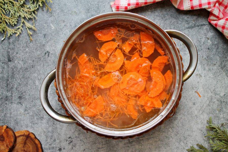 Репчатый лук мелко порежьте и выложите в кастрюлю. Половину моркови натрите на средней терке, остальную нарежьте полукольцами и добавьте в уху. Доведите все до кипения, убавьте огонь и варите в течение 25-30 минут, до готовности овощей.