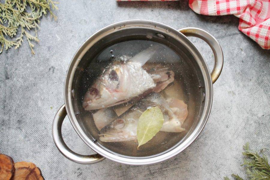 В кастрюлю выложите рыбные головы, влейте холодную воду, добавьте лавровый лист, перец горошком, немного посолите и поставьте на средний огонь. Доведите все до кипения, удалите пену и варите на медленном огне в течение 30 минут.