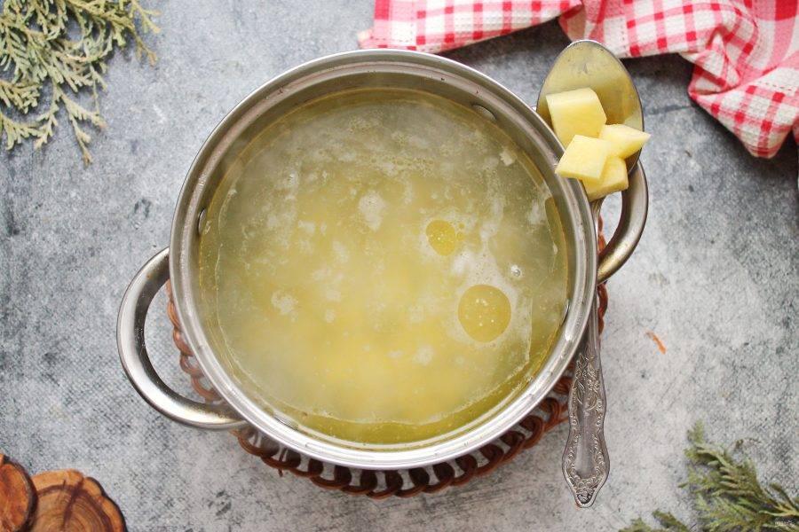 Картофель порежьте средним кубиком и выложите в кипящий бульон.
