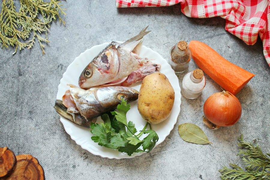 Подготовьте все необходимые ингредиенты для приготовления ухи из рыбных голов. Овощи вымойте, почистите и сполосните. У рыбных голов, у меня голова судака и крупной кефали, удалите жабры и глаза, сполосните.