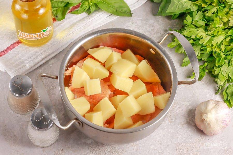Нарежьте хребет семги на части и выложите его в кастрюлю, казан. Нарежьте картофель средними кубиками и добавьте в емкость.