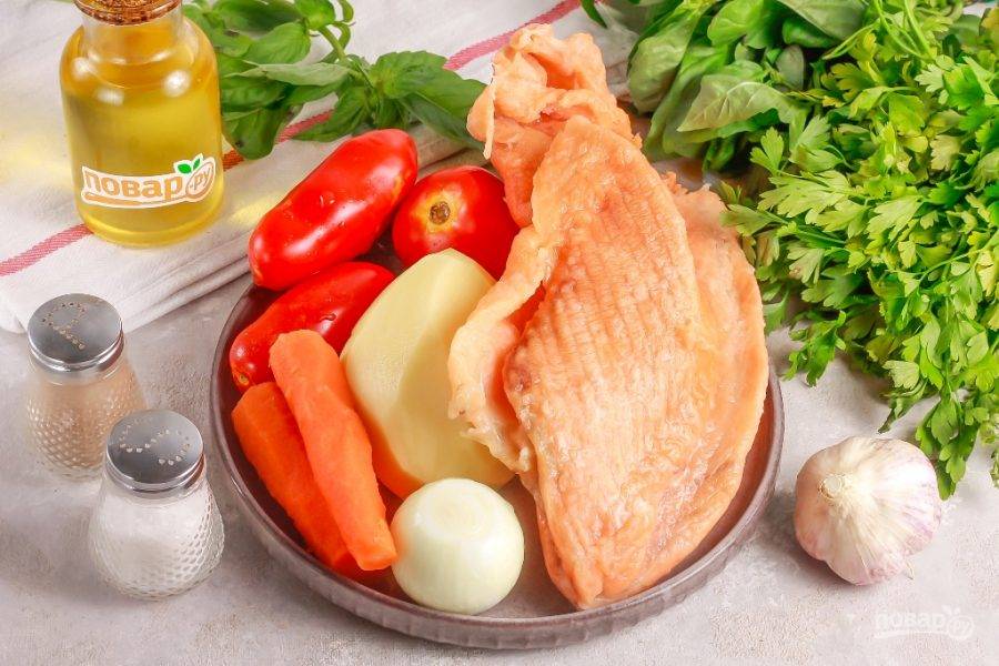 Подготовьте указанные ингредиенты. Очистите от кожуры и промойте в воде картофель, морковь, лук и чесночные зубчики. Промойте суповой набор, срежьте хвост, плавники и удалите крупные кости.