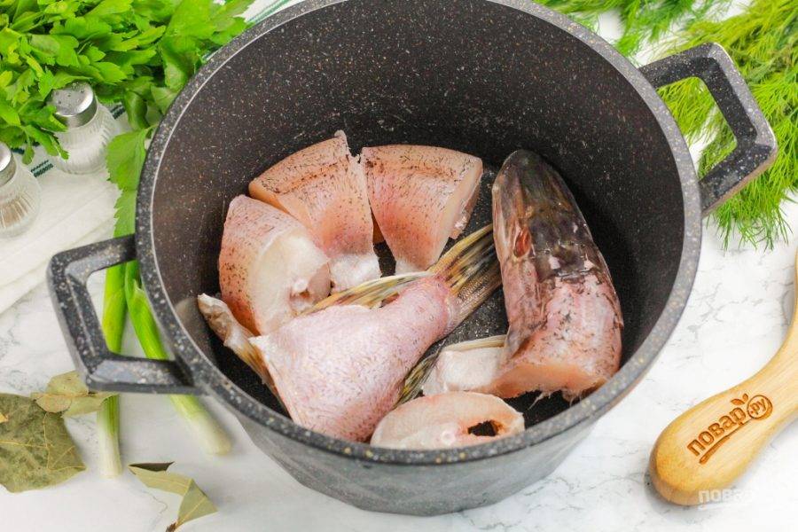 Нарежьте щуку на части и выложите в казан или кастрюлю. По желанию вырежьте из головы рыбы жабры и глаза.