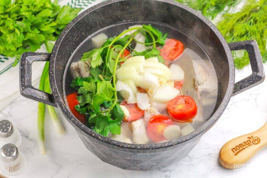 Дополните нарезкой лука и веточками стеблевого сельдерея. По желанию добавьте и другую свежую зелень. Отварите в течение 5-10 минут, всыпав соль. Можно добавить приправу для рыбы или другие специи.