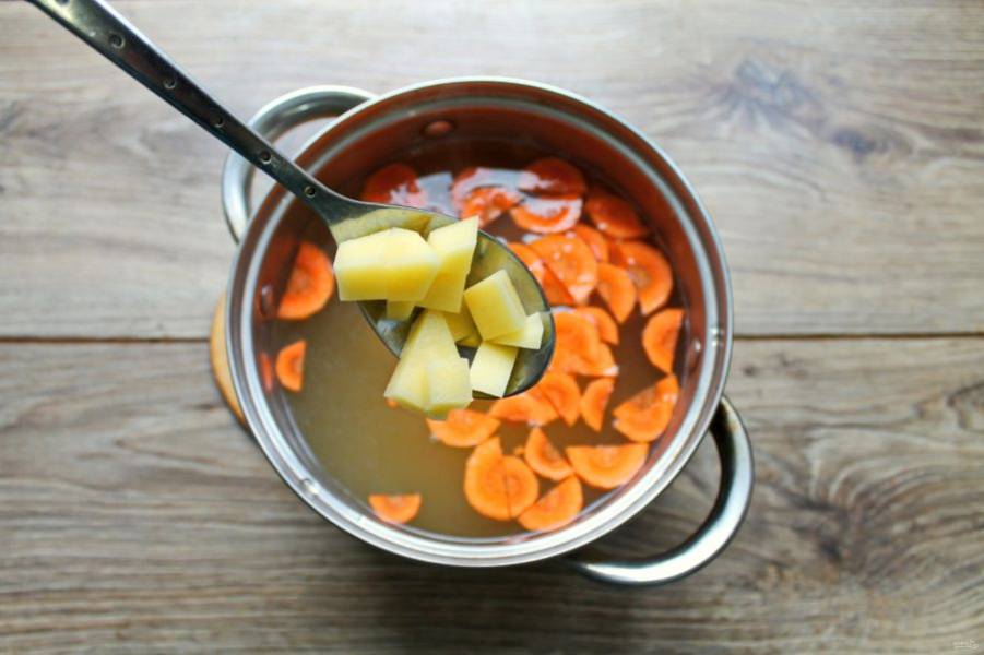 Картофель почистите, порежьте кубиком и добавьте в бульон с морковью.